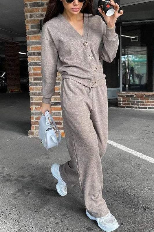 The Aspen Knit Set brings together effortless comfort and modern style. Designed for everyday wear, this two-piece ensemble includes a button-up knit cardigan and wide-leg drawstring pants, making it the perfect choice for lounging, casual outings, or travel-ready looks.